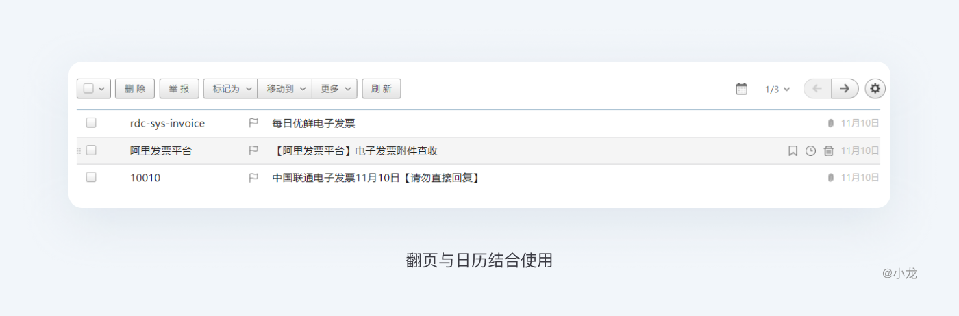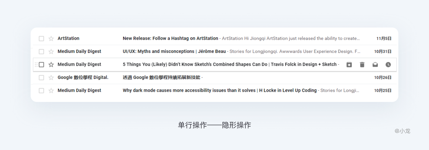 如果行操作不那麼重要,或者說行操作過於囉嗦影響用戶閱讀時,可使用隱形操作,鼠標在行區域懸停時,可對當前行背景作出區分,或放大懸停區域,同時行尾出現可操作按鈕,進行行操作。如穀歌郵箱: