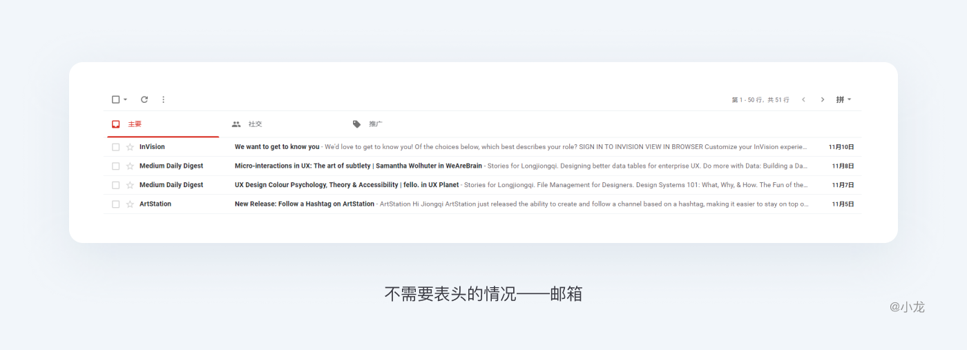 如果表格數據可以自我解釋,表頭就可以不需要。電子郵件的表格是一個好例子,郵件主題,發送者,發送日期都區別度高不會混淆的。當然有的情況表頭是不能去掉的,例如有兩個不明確的日期,這時候你就需要定義一個表頭。