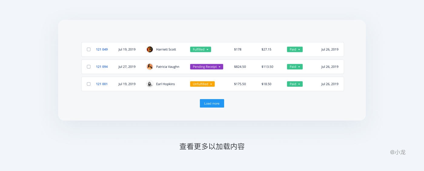 底欄在表格最下方,主要展示正文中的數據量或單頁數據的概覽信息,也常提供統計功能,供用戶了解總體進展。底欄一般放統計信息、分頁控件、備註說明、操作按鈕(加載更多)等內容。