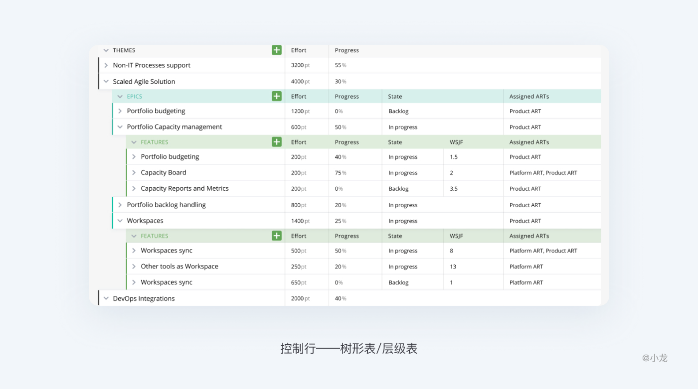 行也可以結構化分為不同的類別,前面提到了層級表/樹形表,可以嵌套子表格,展開和折疊。可操作按鈕一般位於各級行標題左側,具有獨特的視覺效果並具有擴展或折疊的功能。單擊表中的類別標題會在類別的展開或折疊狀態之間切換。展開與折疊也將極大的影響行內容顯示。