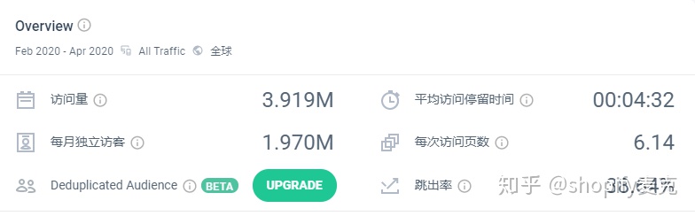 3、然後我們通過similarweb來分析一下這個網站的綜合指標,包括平均訪問停留時間、每次訪問頁數和跳出率,這三個指標綜合來看,GymShark網站內容做得非常不錯的,受眾來到這個網站都會認真地逛一逛,注意不是瞄一眼就走了哦,如果大家不是做的單品站,就要把內容做好,讓來到網站的受眾盡量停留時間長、跳出率降低,這樣轉化率才會提高。