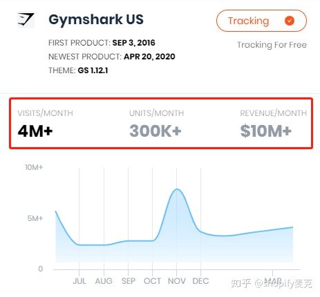 1、網站的流量有多少。通過我的一個監測工具我們可以看到GymShark每個月的網站訪問量超過4百萬,店鋪月流水最少的2百萬美刀,多的高到1千萬美刀。