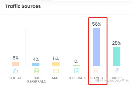 2、接下來我們看看這個網站的流量來源,高達56%流量來自搜索,其次是28%直接訪問,然後是社交媒體、聯盟、郵件行銷。從這個流量來源和分佈來看,通過品牌前期的紅人行銷,還有網站本身的seo優化,現在GymShark這個品牌詞已經做起來了,受眾更多的是直接搜索品牌詞查詢了。