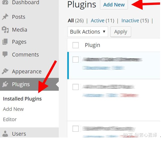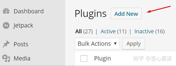 獲得WordPress付費版插件的Zip壓縮文件之後,回到WordPress網站後台的管理員控制面板,然後點擊側邊欄菜單的“Plugins”,然後點擊“Add New”開始安裝新插件。