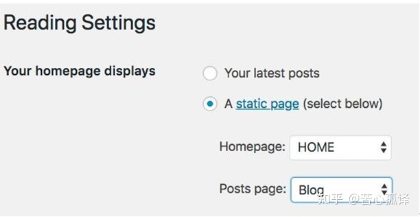• 下一步需要按照Settings→Reading的順序操作,然後選擇新創建的“Blog”頁面為“Posts page”(文章頁面),如下圖所示: