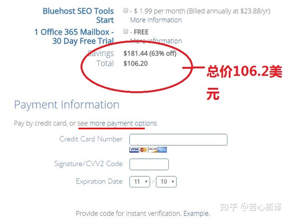 接下來,我們把域名隱私及保護,SiteLock安全,Codeguard Basic三個選項全部取消,最後就能看到總價是106.2美元。請注意,這是3年的總價。按照2019年11月的匯率算,三年bluehost主機基本版的總費用相當於700多塊錢人民幣。