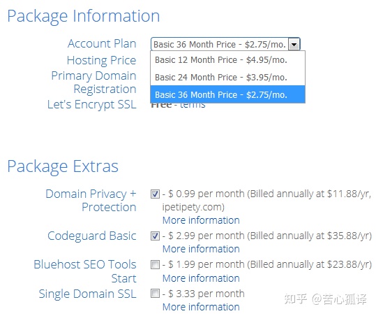 填寫完個人訊息之後,最好看一下所選網絡主機的參數,這些訊息可以在package information(套餐訊息)裡面找到。我們可以看到3種套餐,分為不同價格。默認的2.95美元的基礎套餐是一次性購買3年的服務。