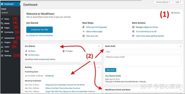 • (1)歡迎訊息:這是wordpress網站管理員最重要的界面之一,裡面有很多快速鏈接。