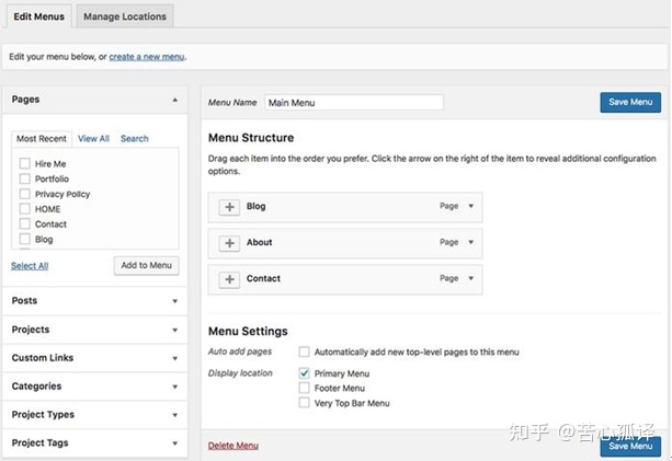 排序結束後,選擇位於底部的菜單位置。通常標有“Primary Menu”(主菜單)的菜單選項是位於網站頂部的導航頁面。然後點擊“Save Menu”把設置過的導航菜單保存一下。